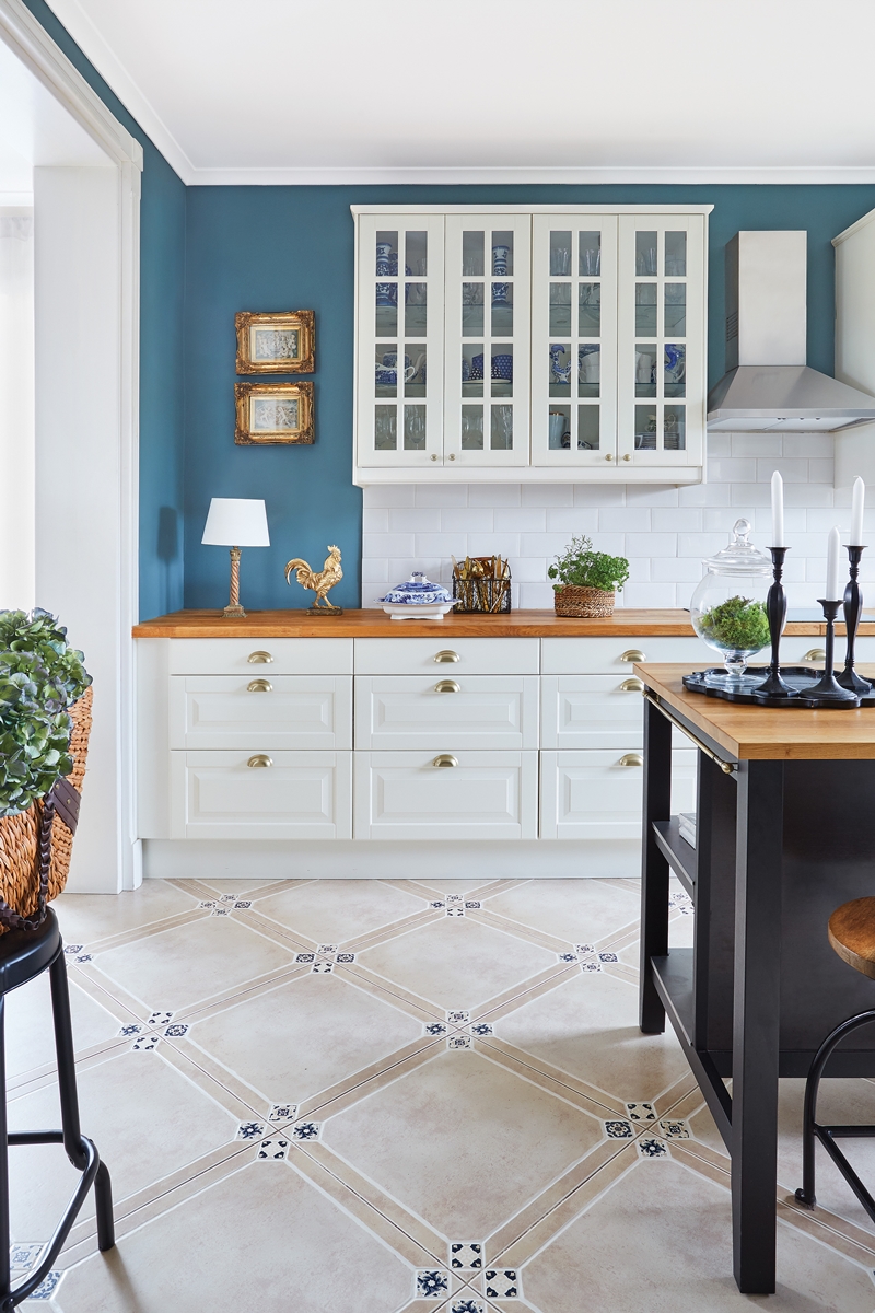 niebieska ściana i białe szafki w kuchni