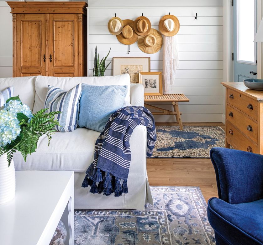Zieleń jak las. Granat i błękit jak morze i niebo. Wreszcie biel chmur. Oto ulubione kolory Jo, właścicielki tego bajkowego nadmorskiego domku z błękitnymi okiennicami.