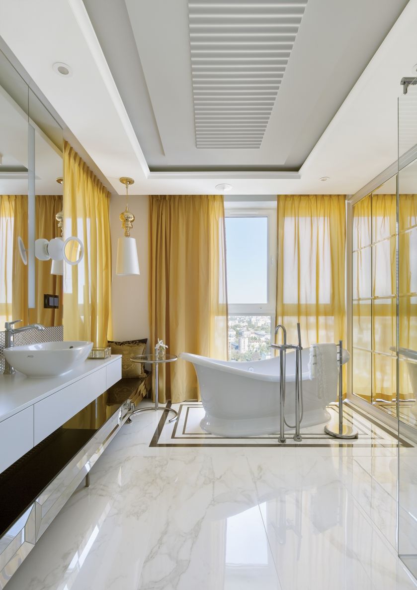 Takie widoki zobowiązują. Nowoczesny, luksusowy apartament został więc urządzony tak, żeby nic ich nie zasłaniało. Tutaj nawet w kąpieli można podziwiać warszawski świt!