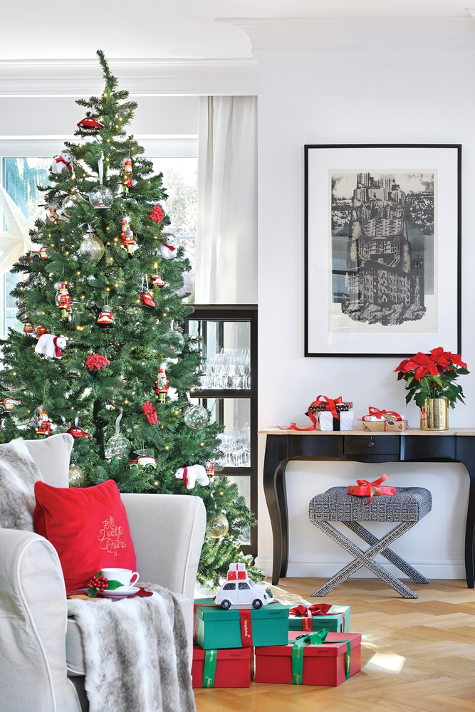 Czerwono-srebrne dekoracje na Boże Narodzenie we wnętrzach urządzonych w nowojorskim stylu