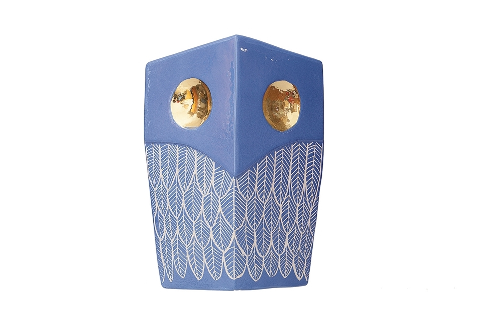 Jakub Niewdana lubi bawić się prostymi formami. Zestawia kilka brył i tworzy oszczędne w formie figurki ceramiczne. Uszlachetnia je kroplą złota.