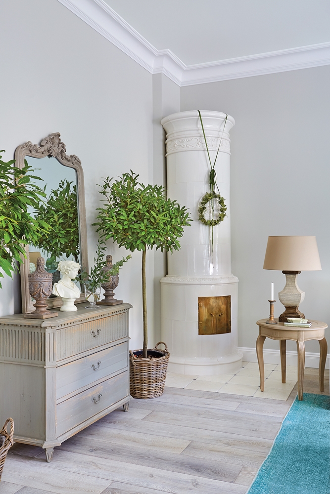 piec w salonie w stylu francuskim