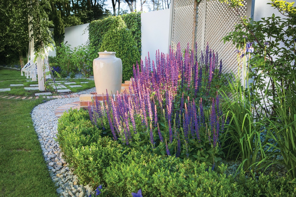 Ten ogród w bieli, fiolecie i zieleni ma ściany z żywopłotu, zakątki z tryskającą wodą, kąciki do podwieczorków i zabawy. Dekorują go „żywe meble” z fioletowych klombów i przycinanych bukszpanów.