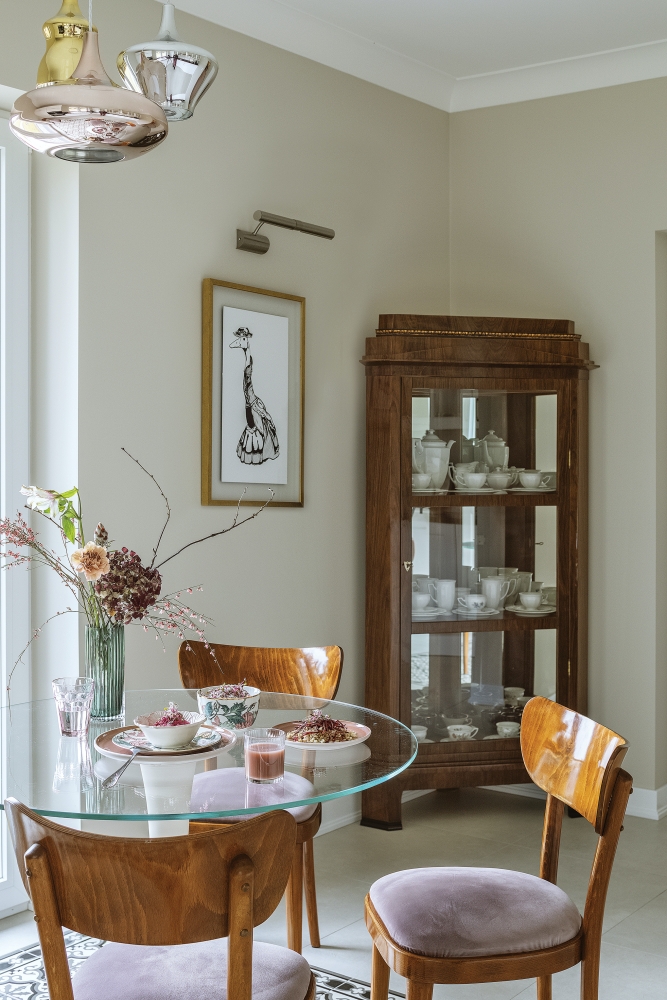 W tym domu klasyka została zgrabnie połączona z nowoczesnością. Stare meble i obrazy tworzą zgrany duet ze szklanymi stolikami i lampami.