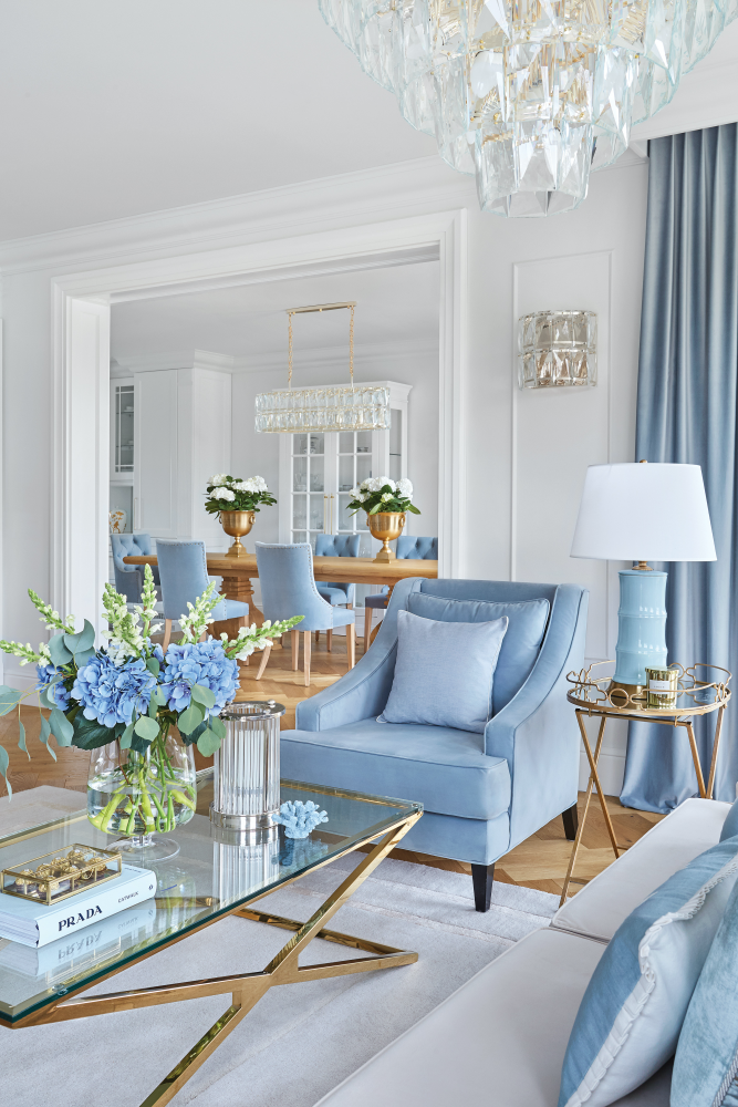 Elegancko, lekko i przytulnie – pastelowy błękit i złote akcenty w klasycznych wnętrzach