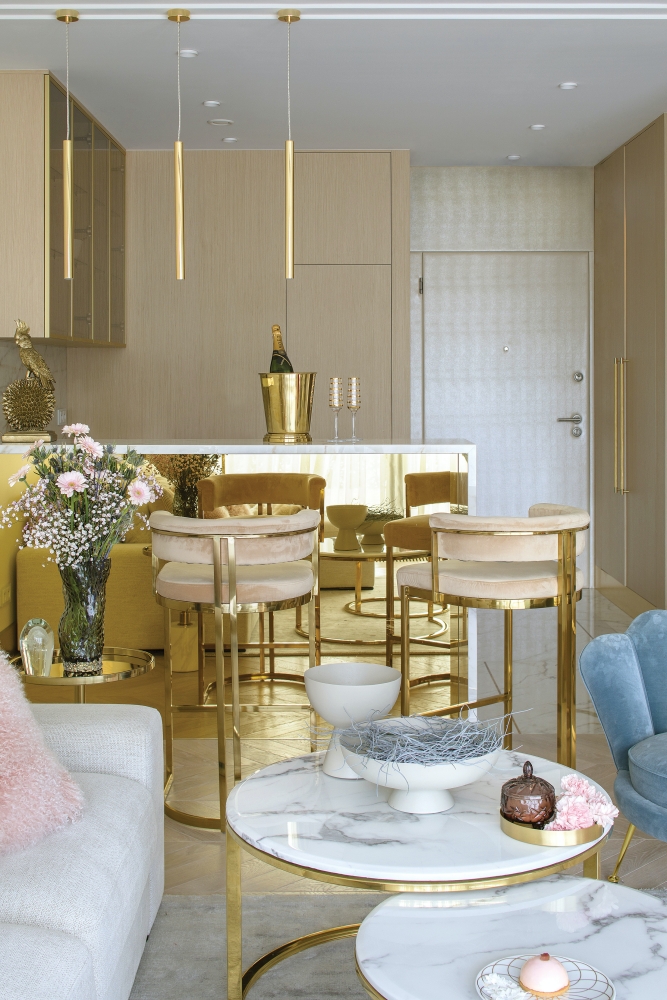 Połączone z jasnymi kolorami, szlachetnymi materiałami, miękkimi tkaninami i pięknie oświetlone złoto może sprawić, że w domu zrobi się kobieco i bardzo przytulnie.