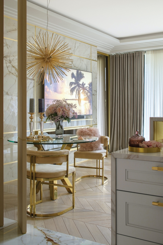 Połączone z jasnymi kolorami, szlachetnymi materiałami, miękkimi tkaninami i pięknie oświetlone złoto może sprawić, że w domu zrobi się kobieco i bardzo przytulnie.