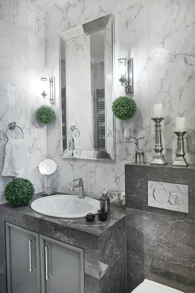 szara łazienka ze srebrnymi dodatkami