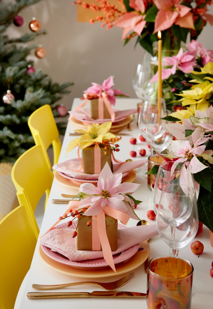 różowe i żółte gwiazdy betlejemskie dekoracje stołu