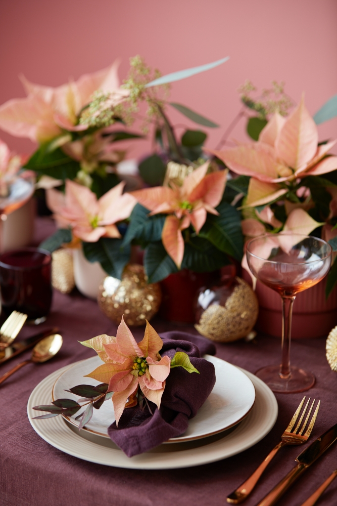 różowa gwiazda betlejemska dekoracje stołu na boże narodzenie