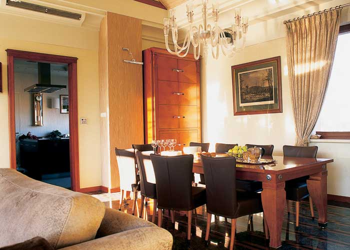 Urządzanie tego apartamentu było wyzwaniem nie tylko dla architekta, ale i dla glazurników, parkieciarzy, stolarzy. Nic nie jest tu zwyczajne – z pokoju do pokoju można jeździć windą, podłogę wycinano z kamienia, a łazienkową mozaikę trzeba było układać jak puzzle. Dwupoziomowe mieszkanie na ostatnim piętrze zwężającego się budynku miało mnóstwo skosów, różne wysokości i niezliczoną ilość belek konstrukcyjnych. Do tego o