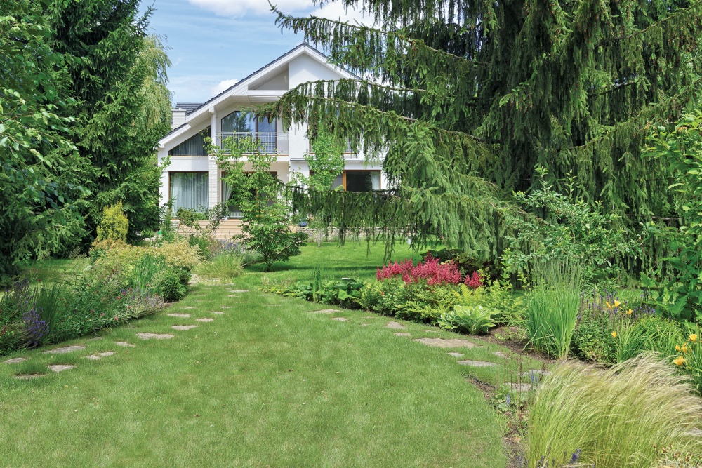 • ogród ze starymi drzewami i zakątkami do odpoczywania