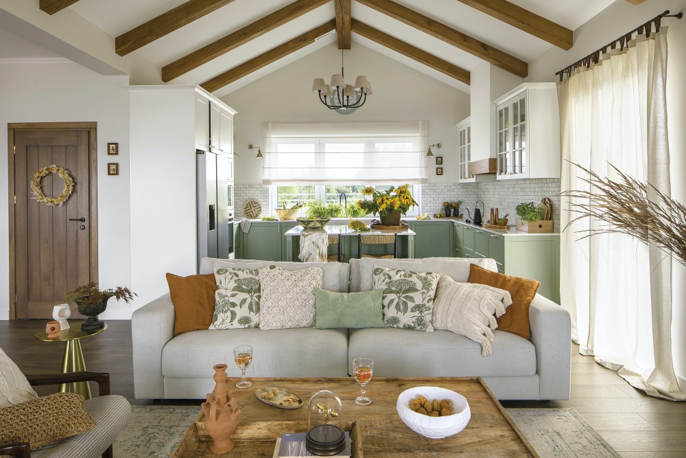 Przytulny i wygodny dom w stylu modern farmhouse – z zieloną kuchnią i mnóstwem drewna