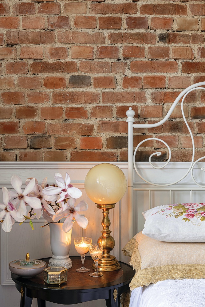ceglana ściana w sypialni
