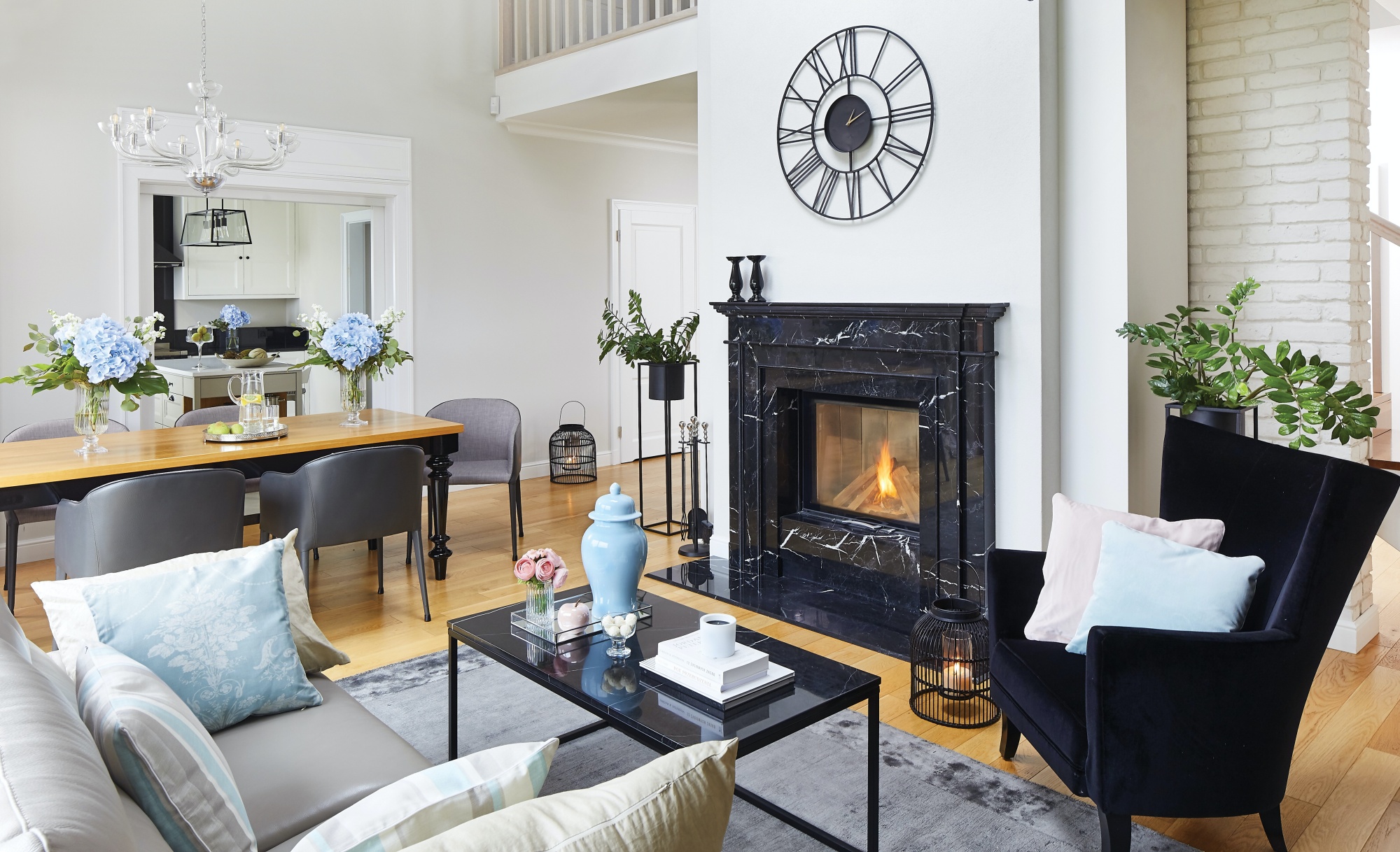 Elegancki i wygodny dom urządzony w stylu modern classic – królują w nim biel, czerń i błękitne dodatki