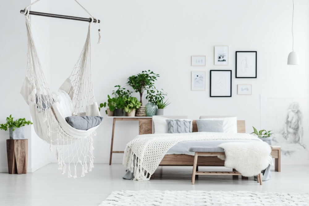 fotel wiszący w sypialni w stylu skandynawskim