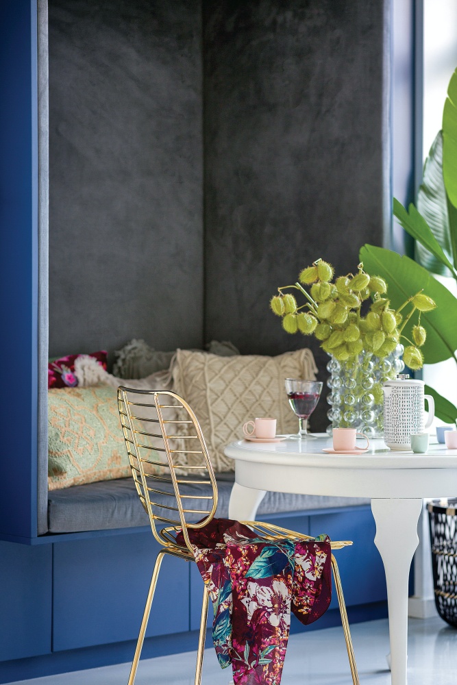 Dom typu kostka stworzony do odpoczywania – wnętrza urządzono pomysłami z podróży. Wykusz pełen poduszek zachwyca!