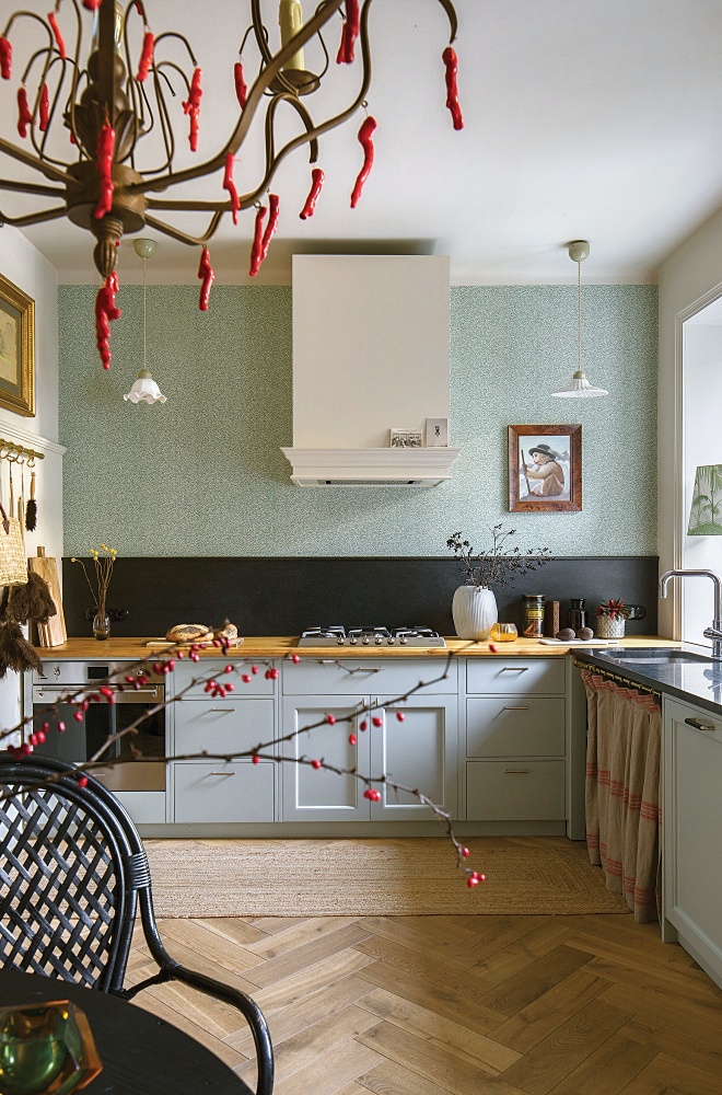 • biała kuchnia z drewnianym blatem