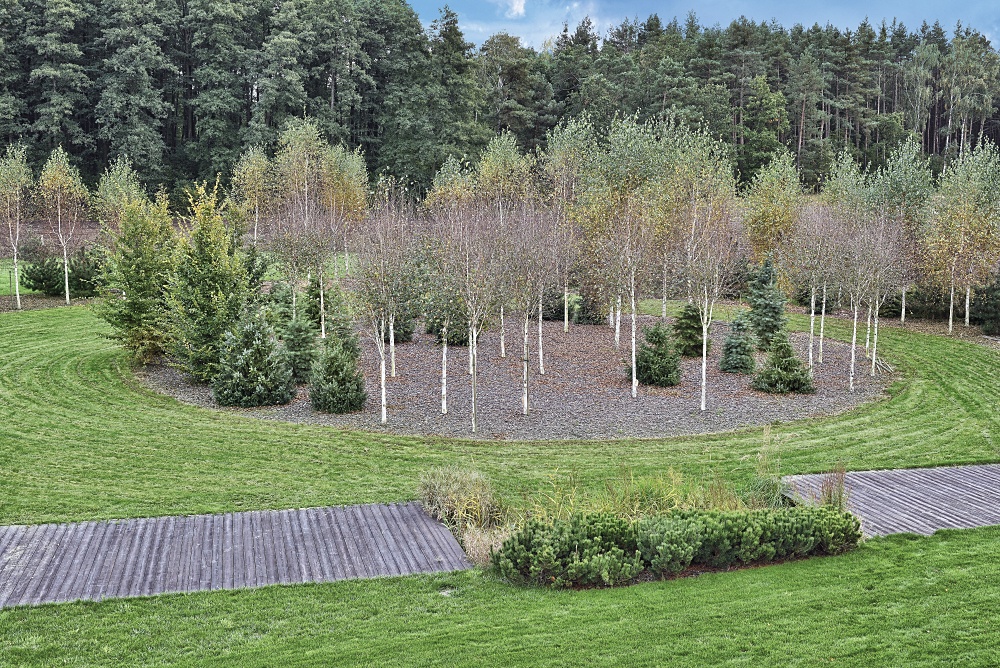 Ten ogród z brzozowym zagajnikiem powstał jak za dotknięciem czarodziejskiej różdżki. Na dziewiczej podmokłej łące wyrosło 350 drzew, które pięknie wtopiły się w leśne tło.