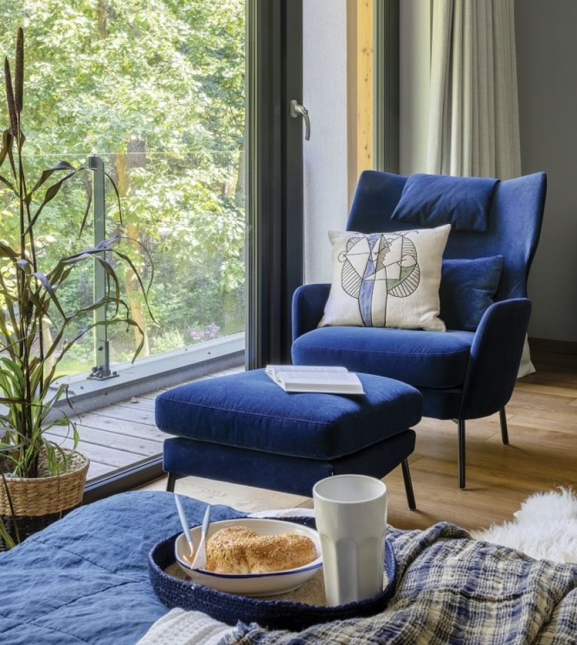 Pierwsza była działka, dom musiał się do niej dopasować. Ma modrzewiową elewację i ogromne okna, przez które, niczym w telewizorze, Karolina, Kuba i ich synek Bruno oglądają niekończący się serial… z życia lasu.
