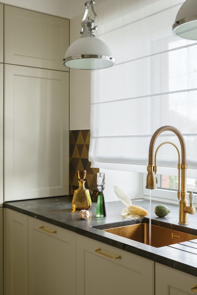 Wnętrza w stylu nowojorskim – malarska tapeta w kuchni robi wrażenie, a złote dodatki dodają im blasku