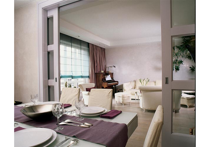 Jadalnię od salonu oddzielają przeszklone suwane drzwi.