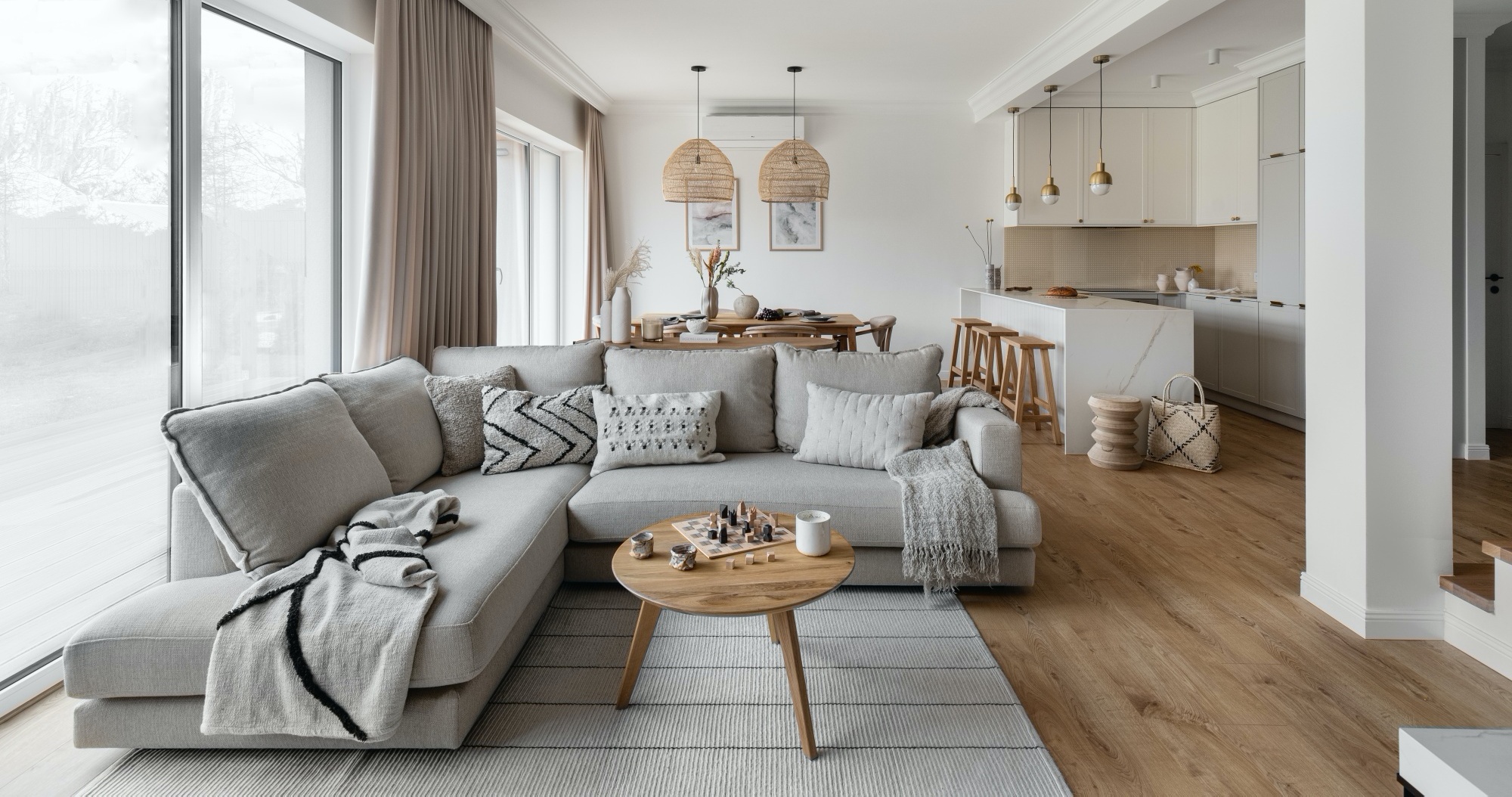 Przytulny dom nad zalewem – w ciepłych, stonowanych wnętrzach królują biel, beże oraz naturalne drewno
