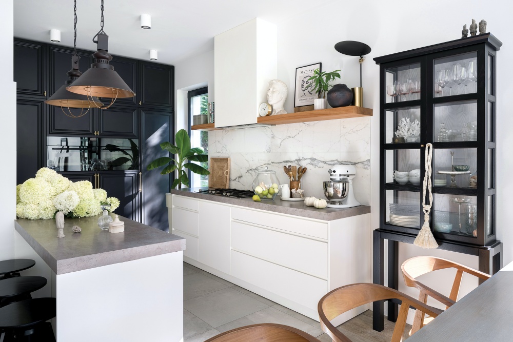 Trochę starego i trochę nowego, kontrast czerni z bielą ocieplony drewnem oraz wchodząca do domu drzwiami i oknami zieleń. Pomiędzy dwoma kaszubskimi jeziorami Magda stworzyła dla swojej rodziny ich własne Bullerbyn.
