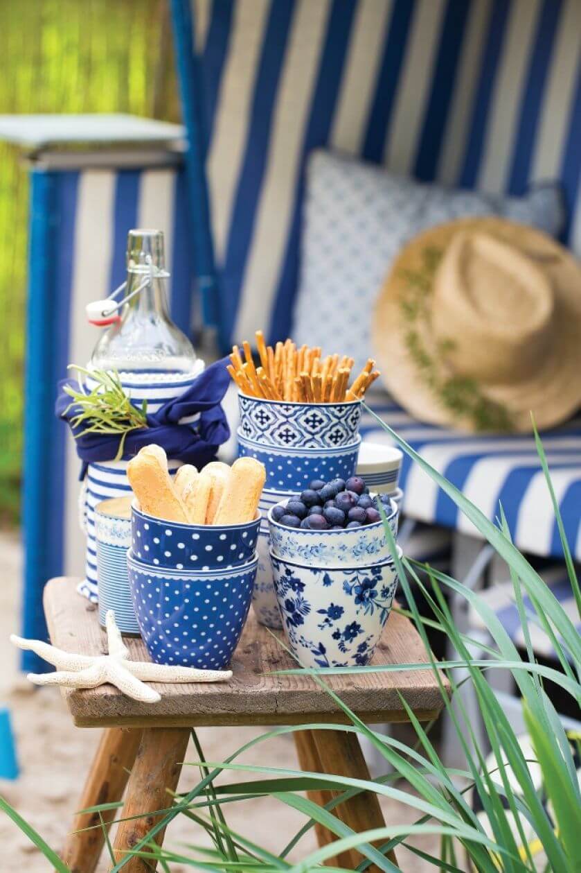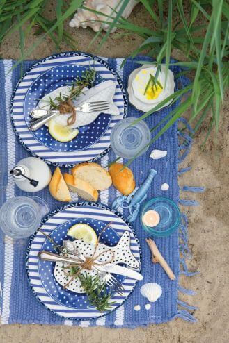 Letni piknik jak nad morzem? Urządzisz go nawet we własnym ogrodzie! Potrzebne będą: wiaderko piachu, plażowy kosz, słomkowe kapelusze, kobaltowe naczynia, poduszki i pledy. Do tego kilka pamiątek z wakacji oraz lekkie przekąski.