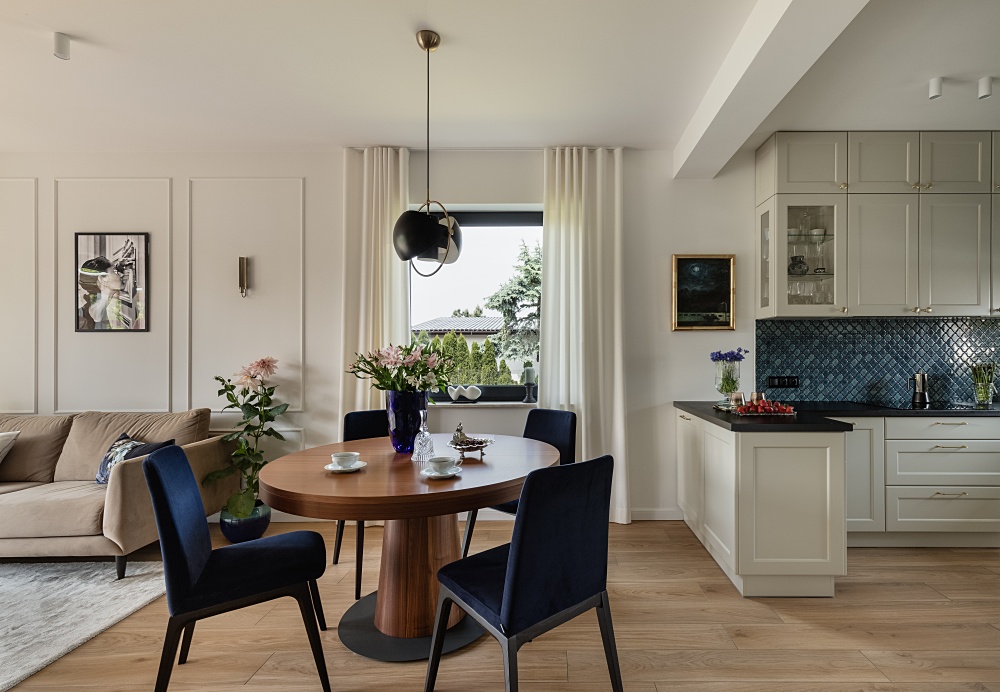 Dom urządzony w stylu nowojorskim – eleganckie wnętrza z akcentami granatu i mosiężnymi dodatkami