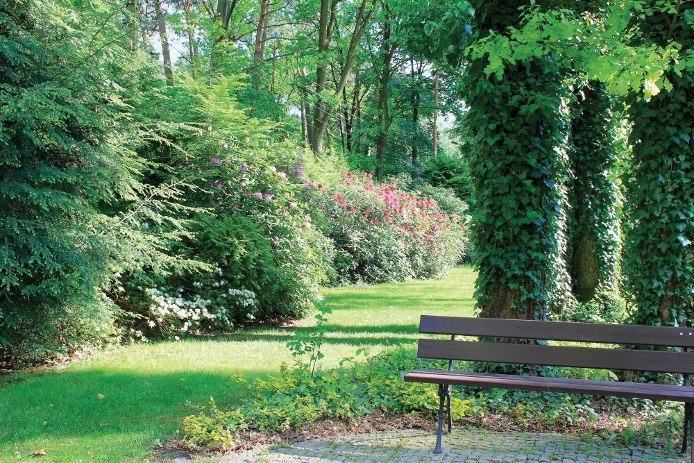 ogród wśród wysokich sosen