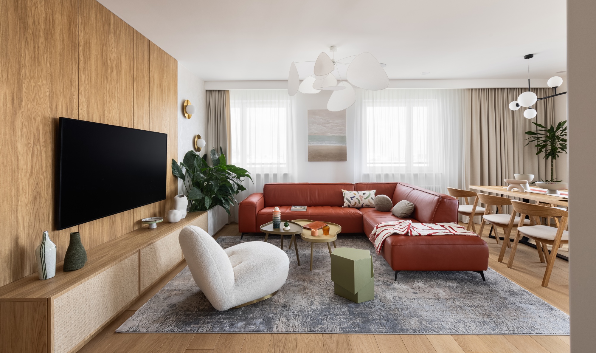 Zapraszamy do eleganckiego i przytulnego mieszkania w Warszawie zaprojektowanego przez Butterfly Studio. Tu rządzą stonowane kolory, które są tłem dla mocniejszych akcentów. Ciepłe drewno tworzy spokojną bazę dla skórzanej sofy w koniakowym odcieniu, a dodatki podkręcają nowoczesny charakter wnętrza. Inspirujące połączenie minimalistycznego japandi z kolorowym twistem.