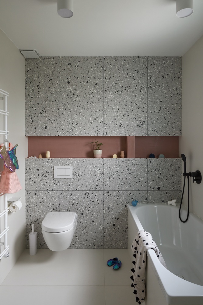 szara łazienka z różowymi akcentami
