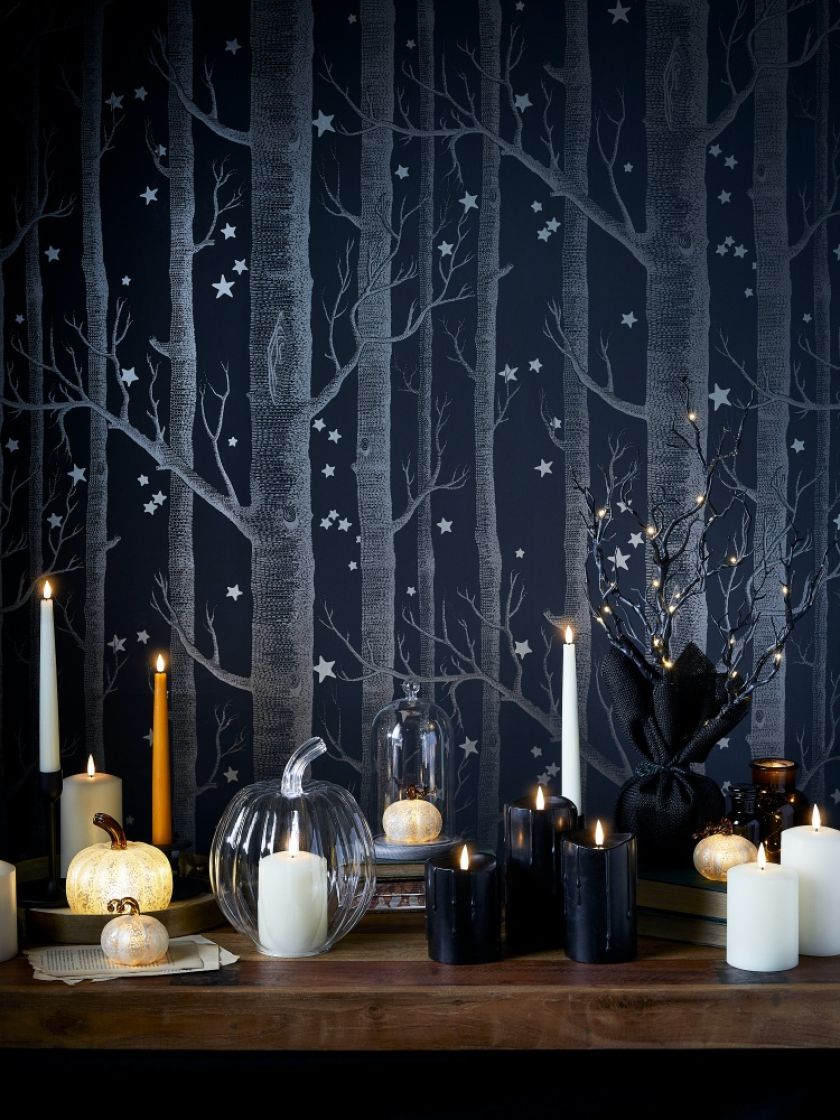 Jak przygotować dom na Halloween? Wykorzystaj dynie oraz dekoracje „z dreszczykiem”, przygotuj winietki, podaj przekąski w paterze pod kloszem, udekoruj ścianę albo kominek...