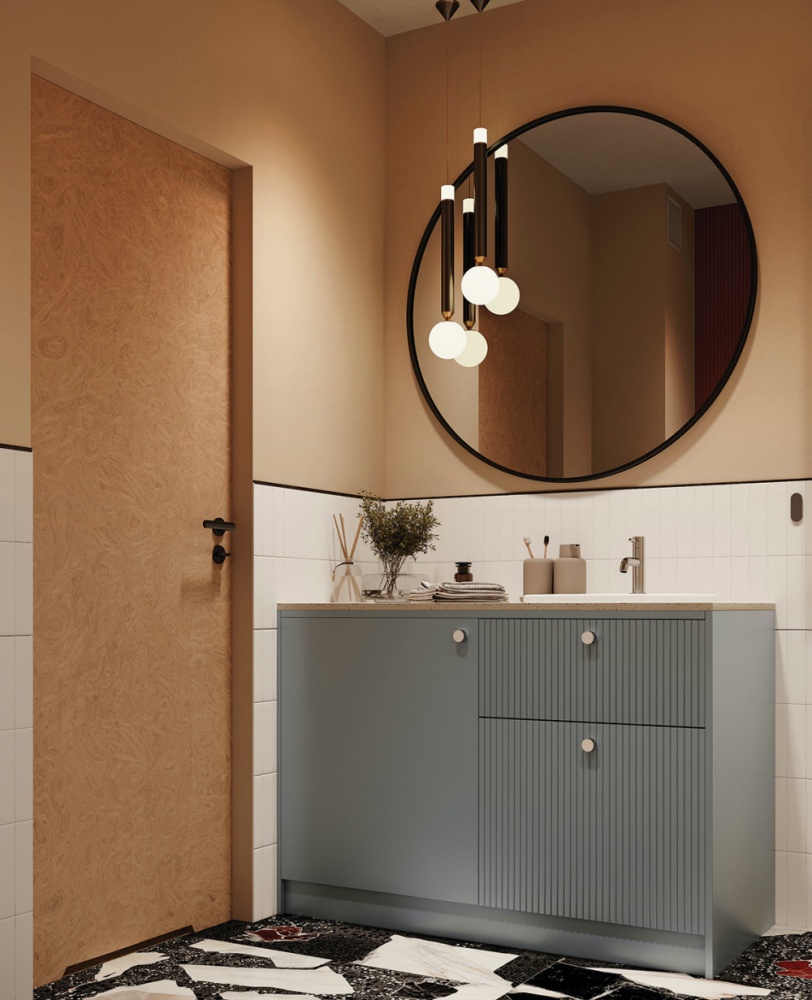 Zapomniane przez dekady luksfery powracają do łask. Przykładem jest ta przemyślnie zaprojektowana 33-metrowa kawalerka, w której dzięki szklanym bloczkom, udało się efektownie wydzielić sypialnię i dobrze ją doświetlić.