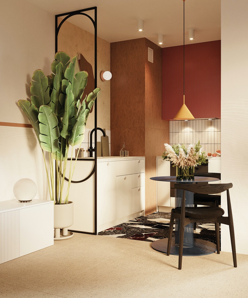 Zapomniane przez dekady luksfery powracają do łask. Przykładem jest ta przemyślnie zaprojektowana 33-metrowa kawalerka, w której dzięki szklanym bloczkom, udało się efektownie wydzielić sypialnię i dobrze ją doświetlić.