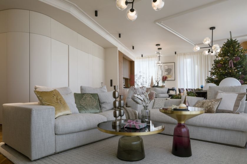 Inspiracją do projektu tego mieszkania był subtelny styl francuski, który architekci dostosowali do potrzeb współczesnej rodziny. W świątecznej aranżacji apartament emanuje ciepłem, blaskiem i atmosferą pełną magii.