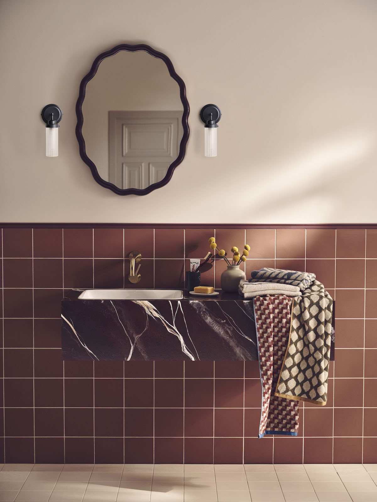 Jak urządzić modną łazienkę 2024? W trendach w aranżacji łazienek są między innymi czekoladowe brązy, kolorowa ceramika i tapety!