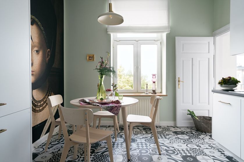 Wnętrze z malarską tapetą na ścianie – to 77-metrowe mieszkanie w kamienicy, mimo ograniczonego budżetu, jest eleganckie i pełne charakteru!