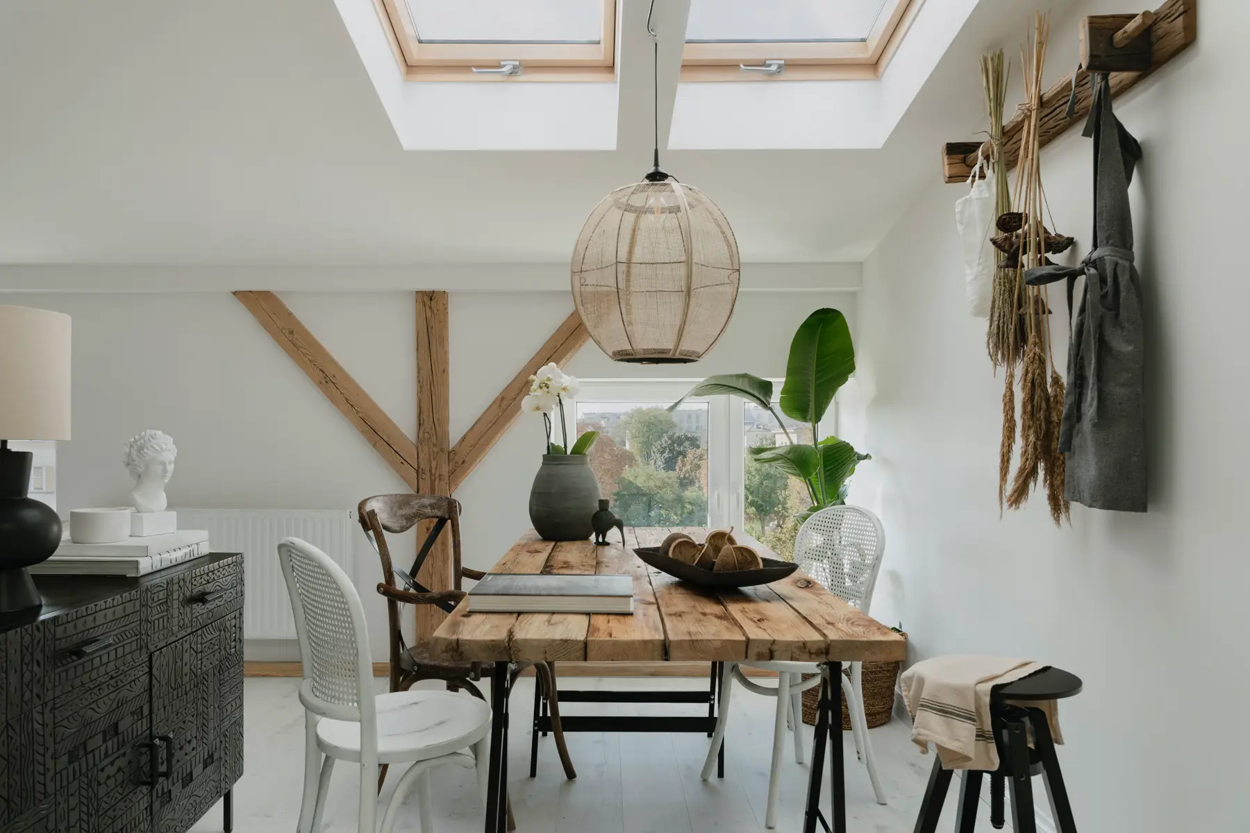Biel, czerń i surowe drewno – mieszkanie 58 m2 na poddaszu z oknami połaciowymi w przedwojennej kamienicy