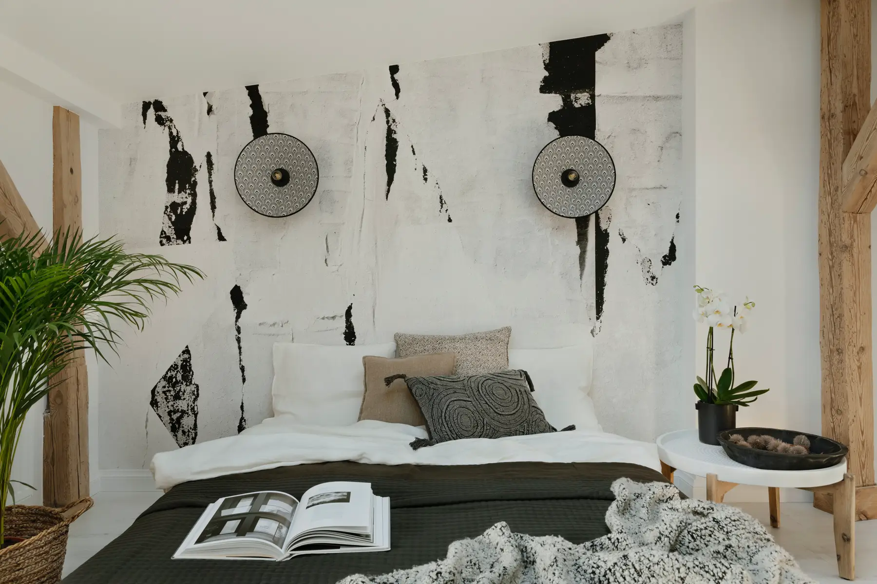 Mieszkanie na ostatnim piętrze kamienicy z lat 30. ma artystyczny klimat z lekką nutą tribal. Czarno-biały klucz kolorystyczny ocieplono dębowym drewnem, a dodatki wniosły do wnętrza przytulność.