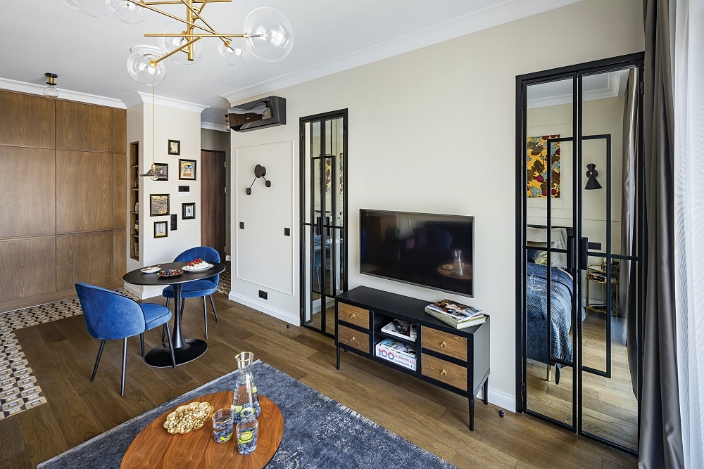 • nowoczesny apartament z klasycznymi detalami i odcieniami bieli i granatu