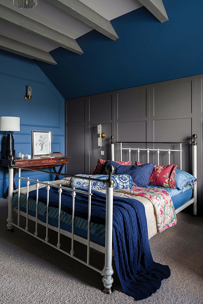• granatowa ściana w sypialni