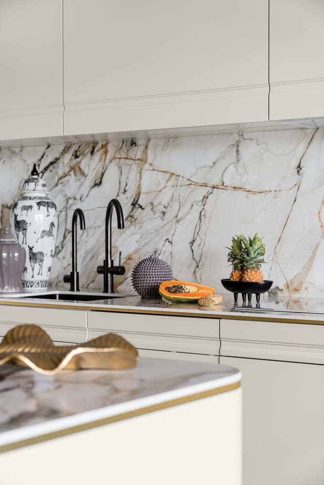beżowa kuchnia z czarnymi i złotymi dodatkami