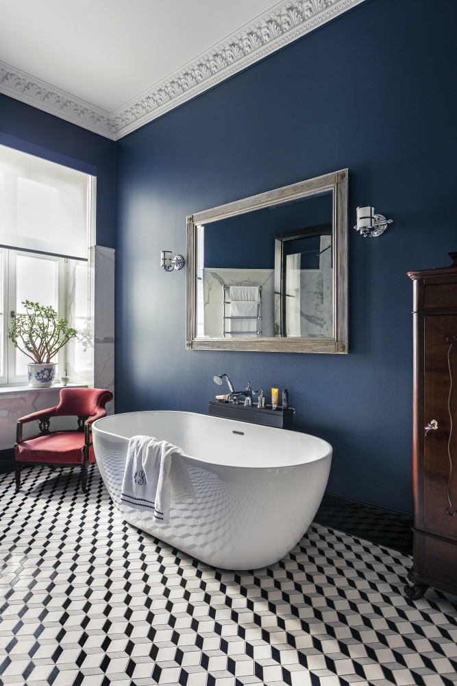 ciemnoniebieska łazienka inspiracje