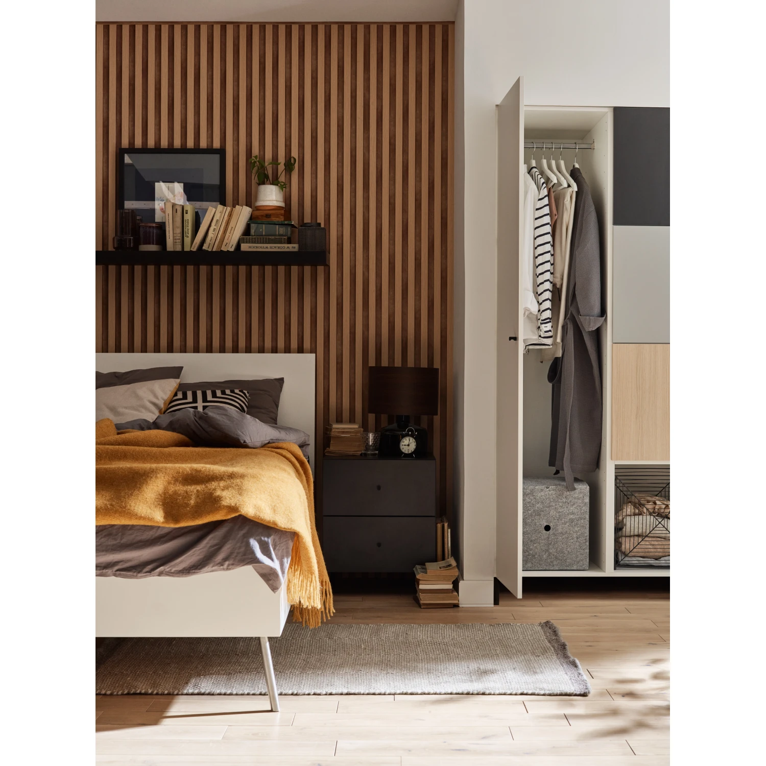 aranżacja małej sypialni z półką nad łóżkiem