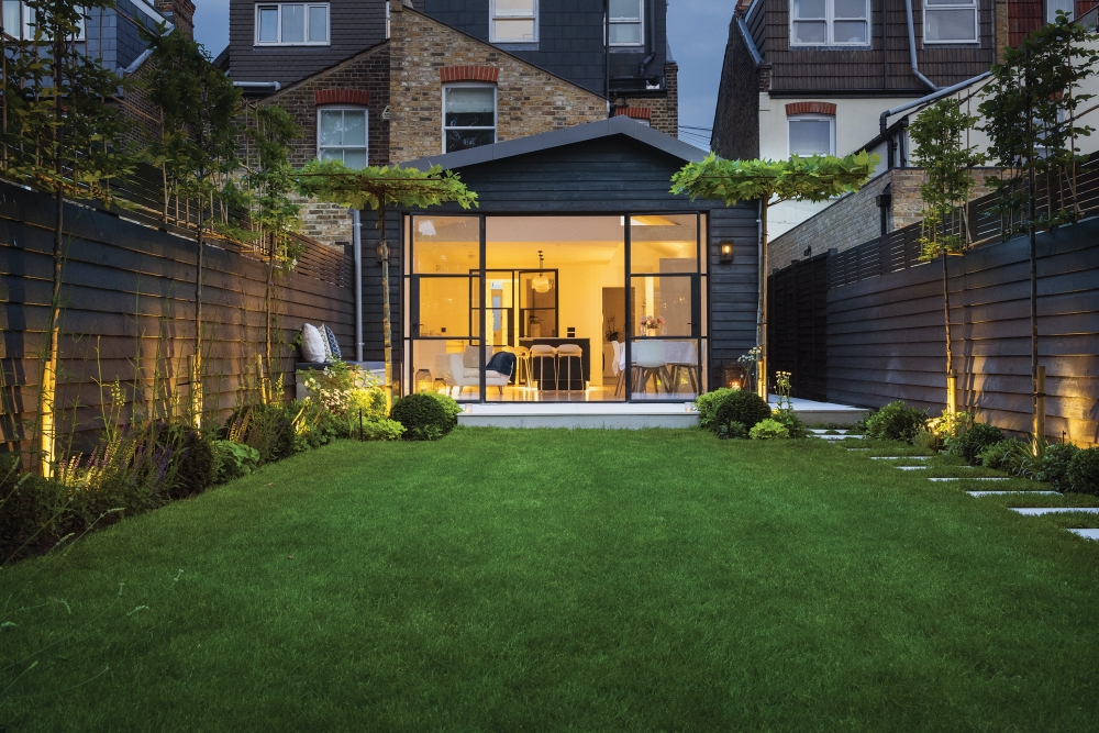 Mały przydomowy ogród z paleniskiem – kolorami roślin i małej architektury nawiązuje do wnętrz