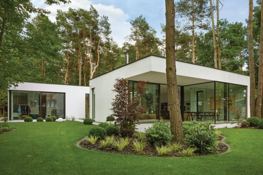 Nowoczesny przeszklony dom w sosnowym lesie – wnętrza ozdabia ciągle powiększana kolekcja malarstwa i rzeźby