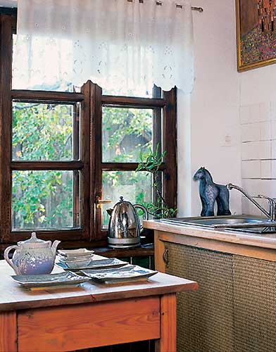 Kuchenne szafki Budzowscy zrobili sami. Drzwiczki ozdobione słomianą matą doskonale pasują do wiejskiej kuchni.