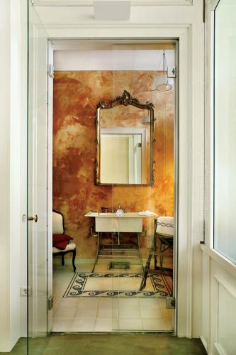 Łazienkę od sypialni oddzielają wysokie szklane drzwi. Stiuk, mozaika, francuskie lustro, stary fotel, biblioteczne schodki